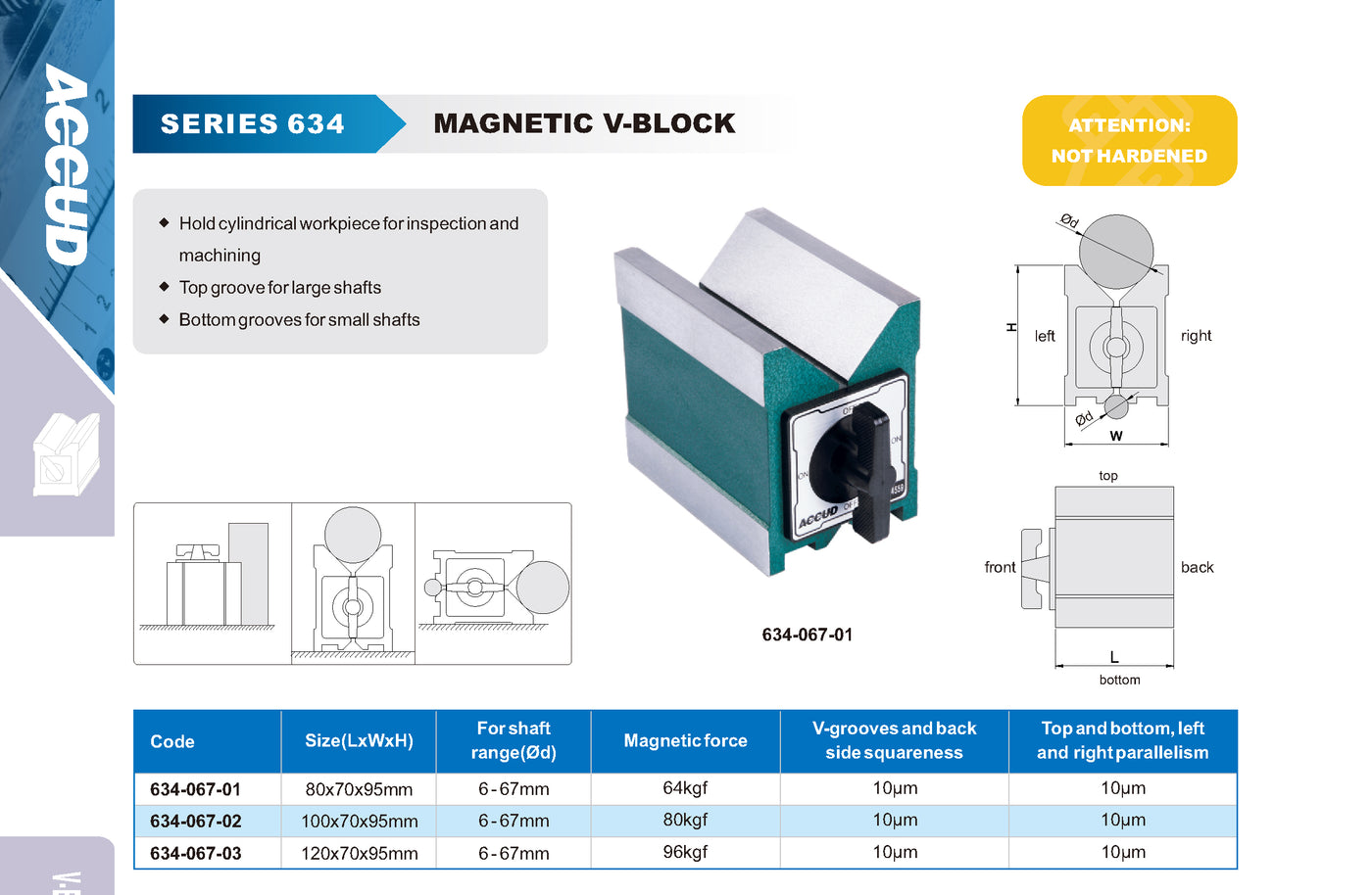 O Bloco em V Magnético da Série 634 é ideal para fixação precisa de peças cilíndricas durante inspeções e processos de usinagem. Projetado com duas ranhuras em "V" (superior e inferior), permite o suporte seguro tanto de eixos grandes quanto pequenos. Possui sistema de acionamento magnético com chave liga/desliga e excelente paralelismo e esquadria para garantir alta precisão.