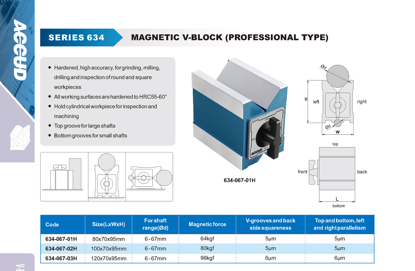 O Bloco V Magnético Série 634 (Professional Type) da ACCUD oferece precisão elevada e robustez para aplicações profissionais em retífica, fresamento, furação e inspeção de peças cilíndricas ou quadradas.