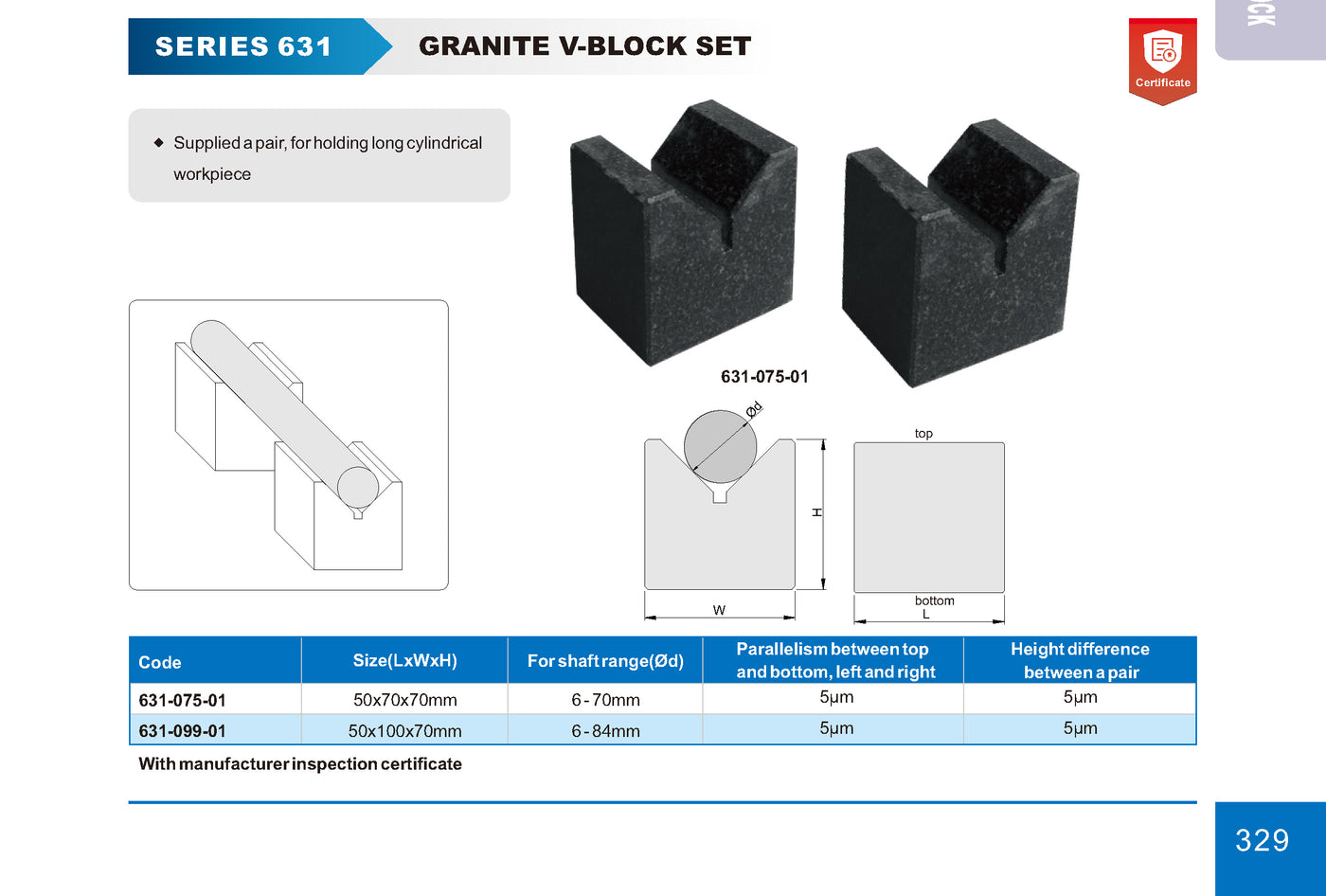 O Par de Blocos em V da Série 631 é fabricado em granito de alta estabilidade dimensional e ideal para suporte preciso de peças cilíndricas durante medições e verificações. Cada conjunto é fornecido com certificação de inspeção do fabricante, garantindo o paralelismo e a uniformidade de altura entre as peças.