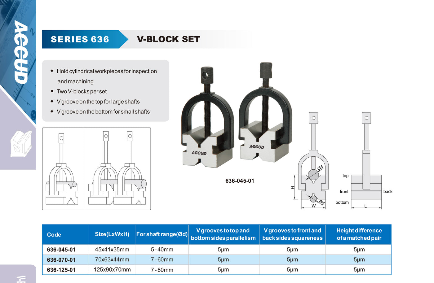 O Conjunto de Blocos V com Grampo da Série 636 da ACCUD é ideal para segurar peças cilíndricas com firmeza durante processos de inspeção e usinagem leve. Fabricado com alta precisão, proporciona excelente estabilidade para eixos de diversos tamanhos.