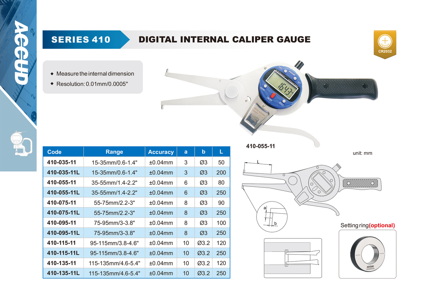 O Medidor Interno com Relógio Digital Série 410 da ACCUD é ideal para medições internas precisas em aplicações industriais. Com resolução de 0,01mm / 0,0005", oferece leituras digitais claras e rápidas, aumentando a produtividade e a confiança nas medições.