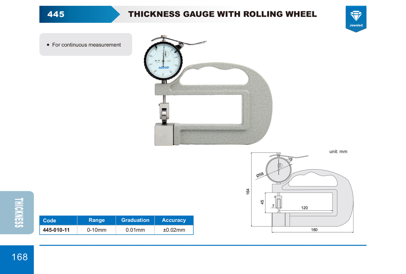 O Medidor de Espessura Série 445 da ACCUD foi projetado para medições contínuas de espessura com precisão e fluidez. Equipado com roda de medição, é ideal para materiais em movimento ou que não podem ser interrompidos durante o processo de medição.