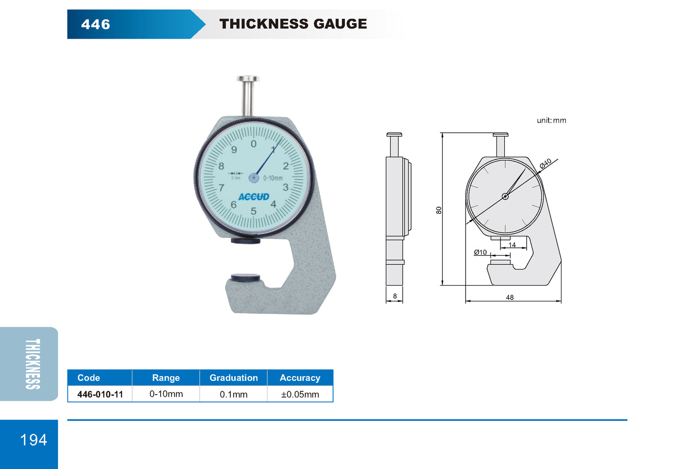 O Medidor de Espessura Série 446 da ACCUD foi desenvolvido para medições práticas e portáteis. Seu formato compacto e mecanismo simples permitem medições rápidas com boa precisão.