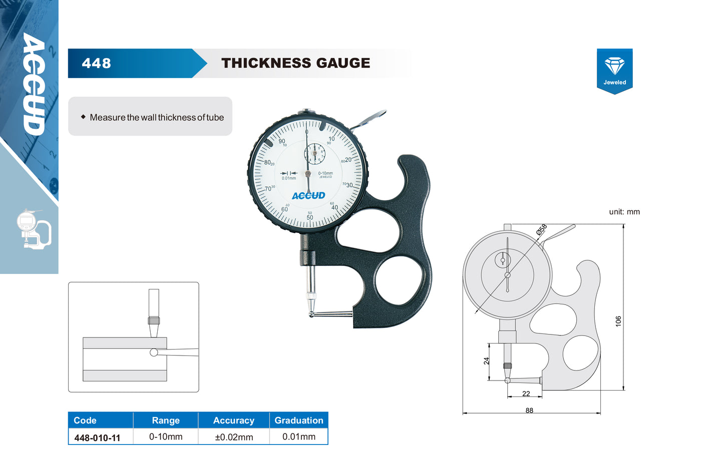O Medidor de Espessura Série 448 da ACCUD oferece alta precisão com um design anatômico tipo garra que facilita o manuseio e a medição. Possui mostrador de fácil leitura e haste de contato fina, ideal para verificações rápidas de espessura.