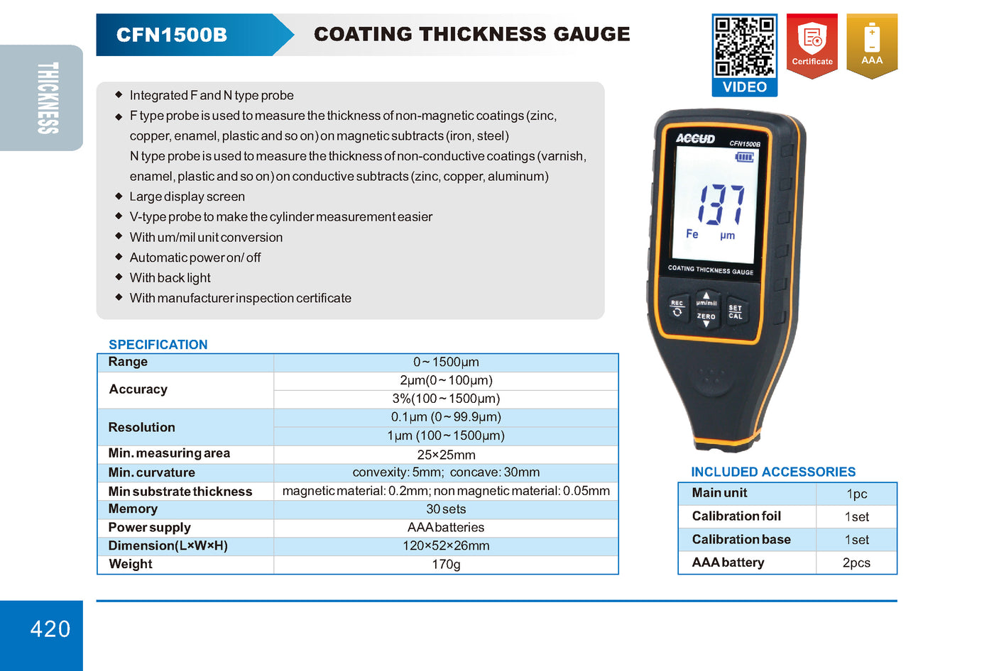 O Medidor de Espessura de Camadas CFN1500B da ACCUD é um instrumento digital avançado para medir com precisão espessuras de revestimentos não magnéticos ou não condutivos. Possui sonda F/N integrada, ideal para uso em superfícies metálicas como aço, ferro, zinco, alumínio e cobre.