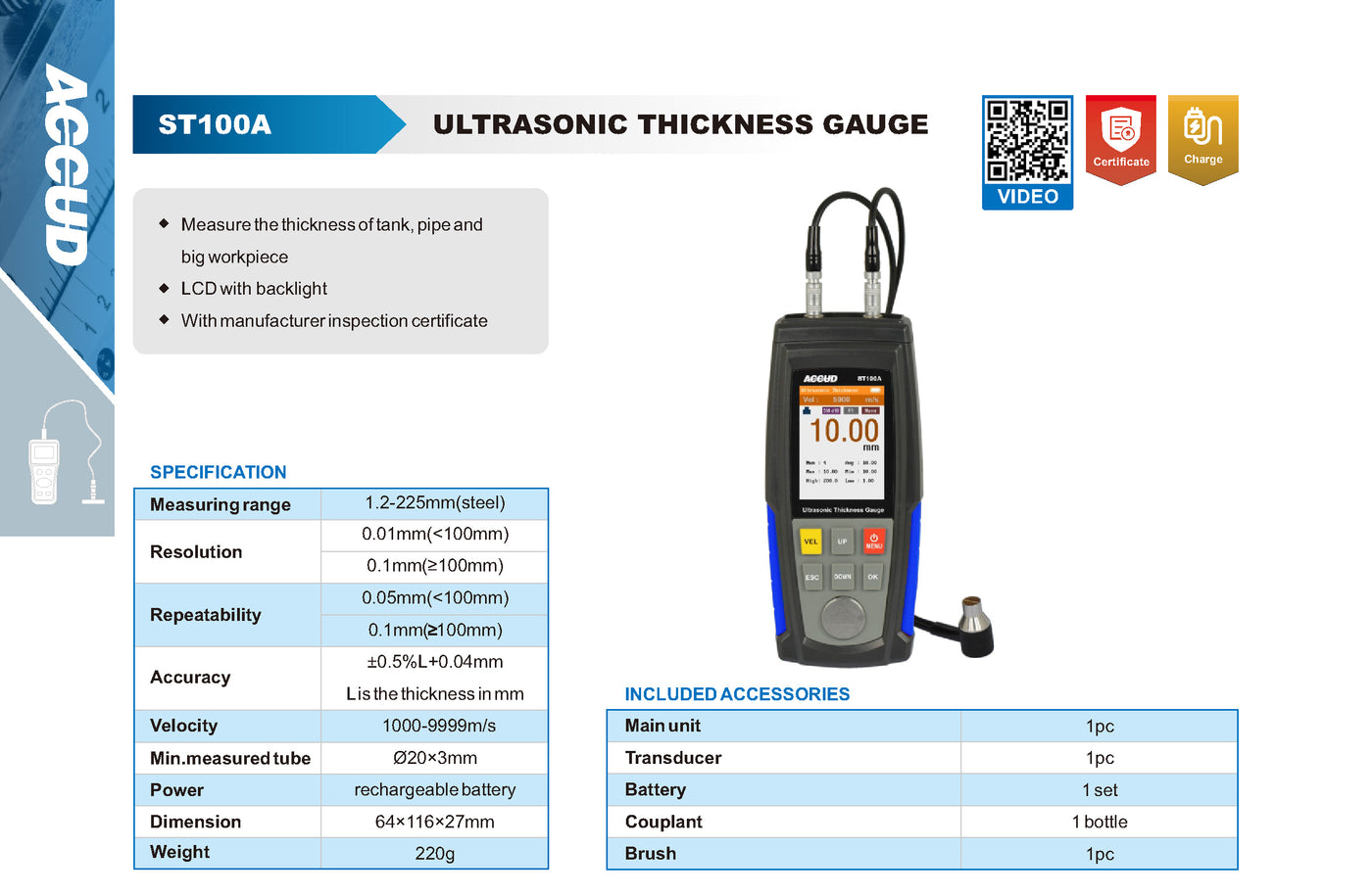 O Medidor de Espessura Ultrassônico ST100A é uma ferramenta precisa e confiável para medir a espessura de materiais metálicos como aço, ideal para inspeção de tanques, tubos e grandes estruturas. Equipado com display LCD com backlight, proporciona fácil leitura mesmo em ambientes com pouca luz.