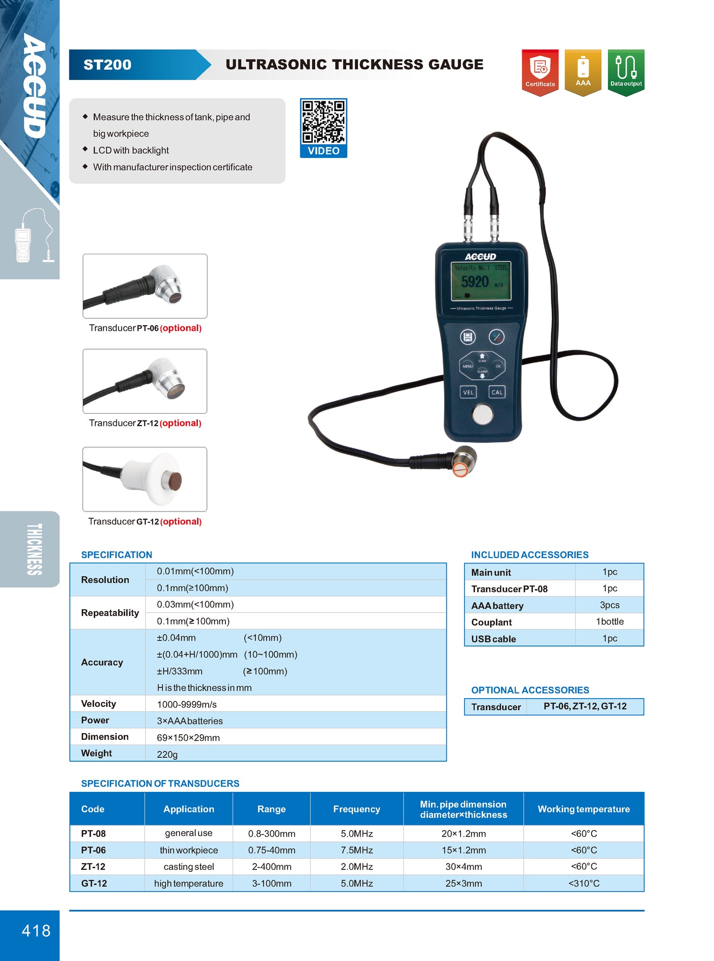 O Medidor de Espessura Ultrassônico ST200 da ACCUD é ideal para medições rápidas e precisas da espessura de tanques, tubos e grandes peças. Possui display LCD com backlight e acompanha certificado de inspeção do fabricante, garantindo confiabilidade em ambientes industriais exigentes.