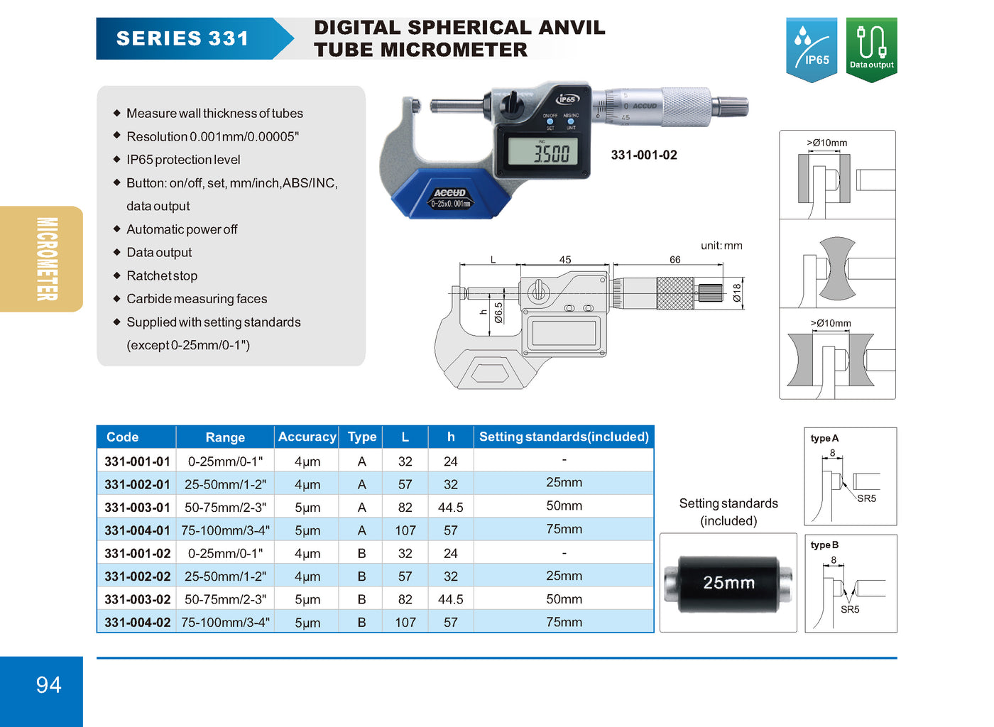 - 331-001-02 – 0-25 mm – Tipo B – ±4μm – h: 24 mm – L: 32 mm
