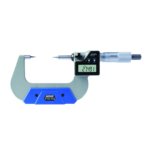 Micrômetro Digital com Pontas Cônicas modelo 317 da Accud, ideal para medir espessuras de alma de brocas, ranhuras estreitas e chavetas com precisão.
