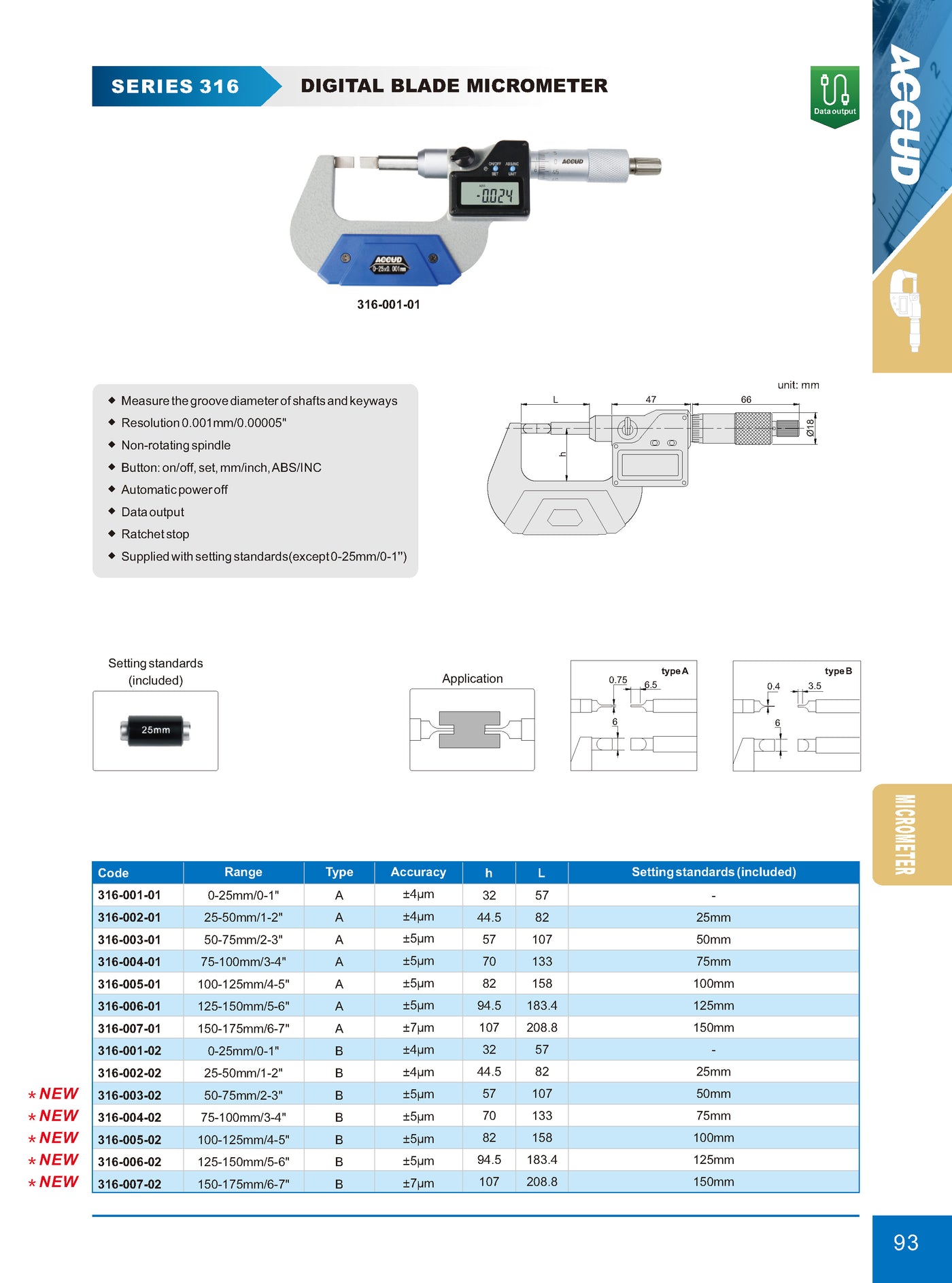 Micrômetro Digital com Pontas de Lâmina modelo 316 da Accud, ideal para medir diâmetros de canais, ranhuras e chavetas com alta precisão.