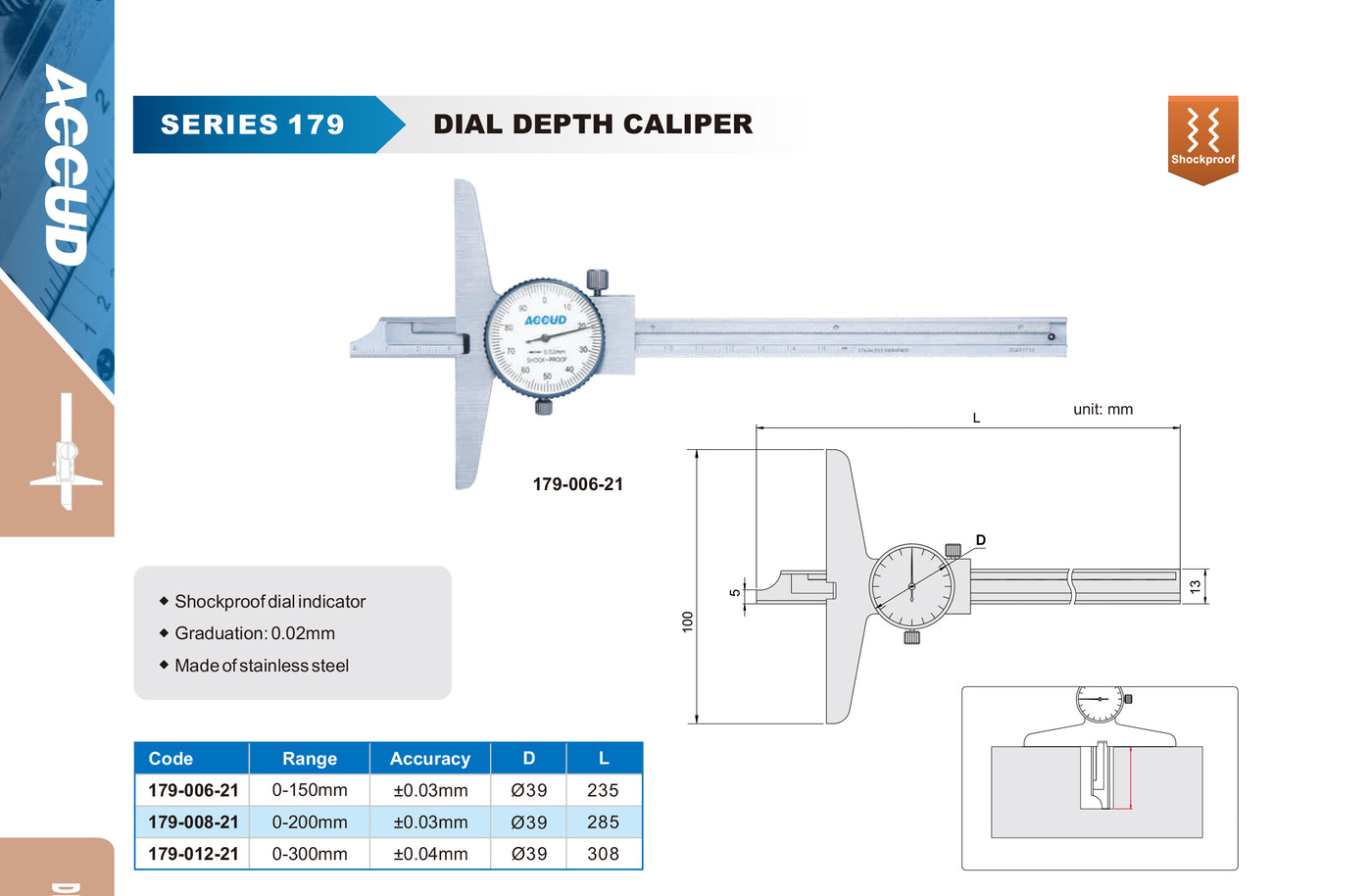 O Paquímetro de Profundidade com Relógio Série 179 é ideal para medições precisas de profundidade em aplicações industriais. Equipado com um mostrador analógico à prova de choque, oferece leitura rápida e confiável.