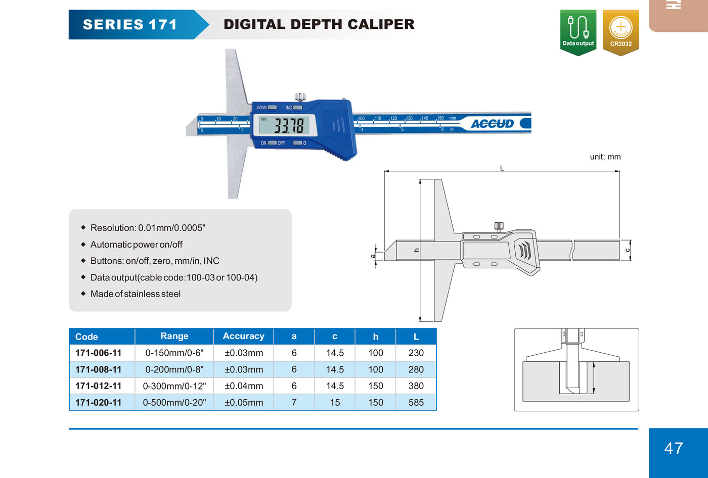 Os paquímetros digitais de profundidade da linha 171-11 oferecem alta precisão e facilidade de uso, sendo ideais para medições em cavidades, furos e sulcos.