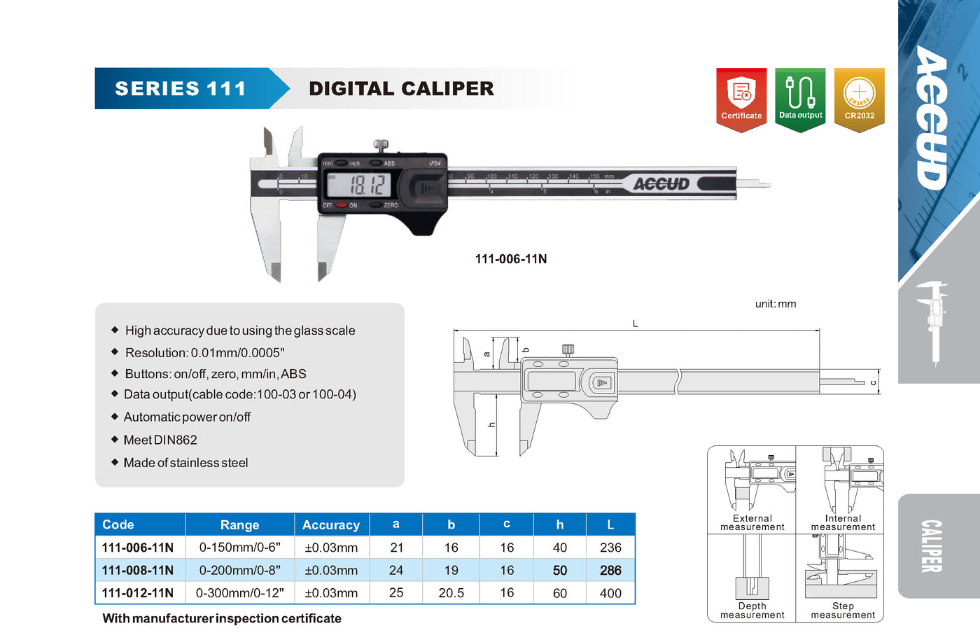 Paquímetro Digital Accud 111-11N Nível de Proteção IP 54 150mm / 200mm / 300mm