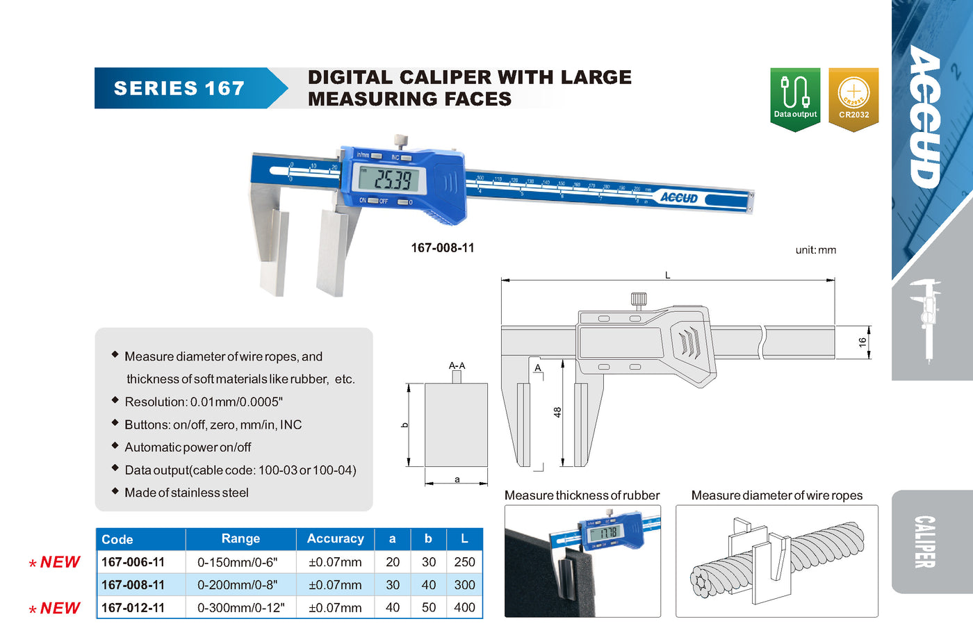 O Paquímetro Digital Série 167 é projetado para medir diâmetros de cabos de aço e espessuras de materiais macios, como borracha e espuma. Com faces de medição ampliadas, proporciona maior estabilidade e precisão em medições industriais.