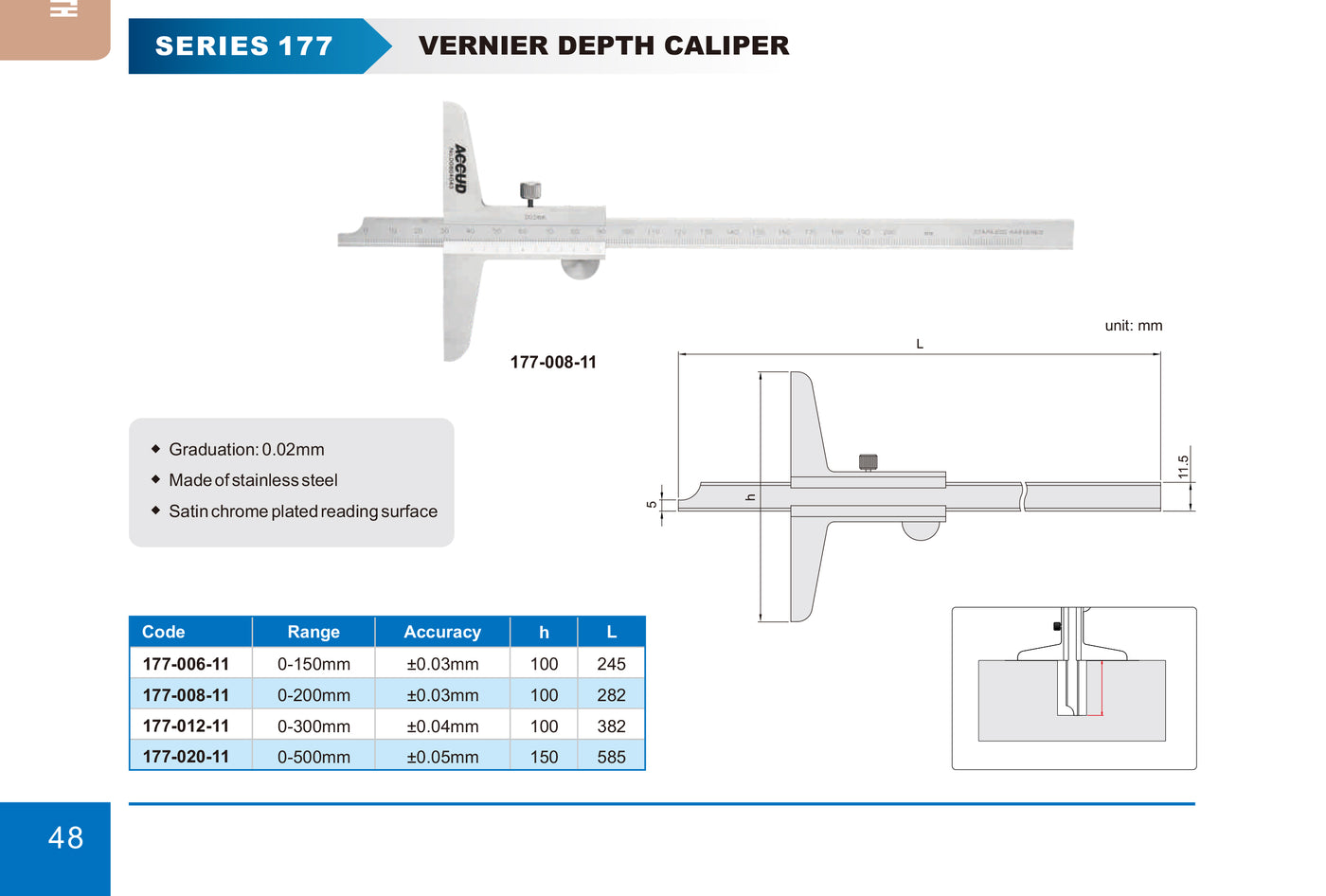 O Paquímetro de Profundidade Vernier Série 177 é ideal para medições precisas de profundidade em diversas aplicações industriais. Fabricado em aço inoxidável, possui escala cromada fosca para melhor leitura.