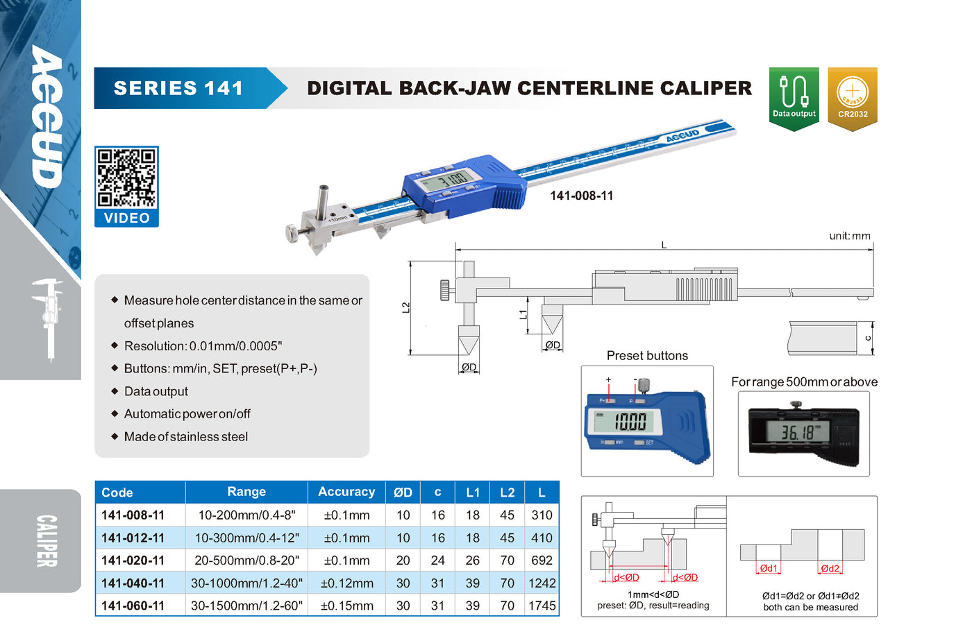 O Paquímetro Digital ACCUD Série 141 é indicado para medição de distâncias entre centros de furos, seja no mesmo plano ou em planos diferentes. Os bicos traseiros especiais permitem o acesso a furos opostos com exatidão e praticidade.