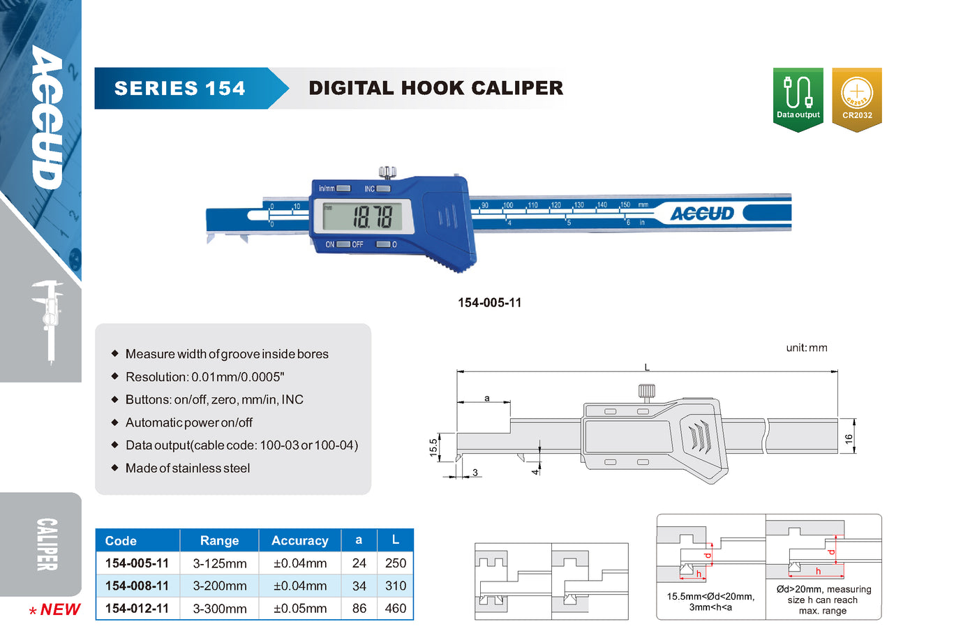 O Paquímetro Digital com Gancho da Série 154 da ACCUD foi desenvolvido para medir com precisão a largura de ranhuras internas e canais dentro de furos. Sua estrutura robusta em aço inoxidável garante durabilidade, enquanto a leitura digital facilita o uso em ambientes industriais e laboratoriais.