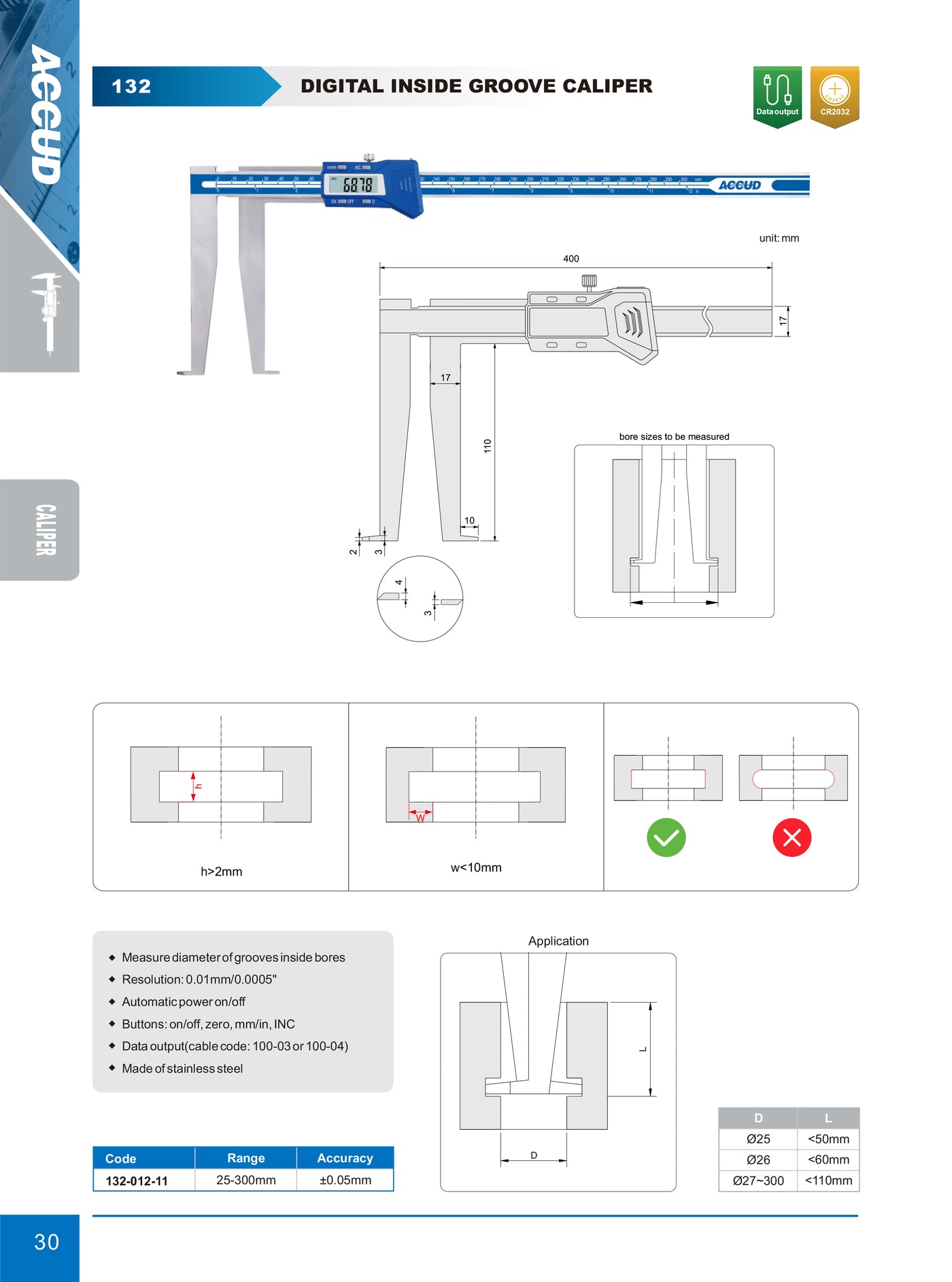 O Paquímetro Digital para Canais Internos ACCUD modelo 132-012-11 é ideal para medições precisas da largura de sulcos ou canais internos em furos, como assentos para anéis de retenção. Robusto e confiável, é indicado para ambientes industriais e laboratórios de metrologia.