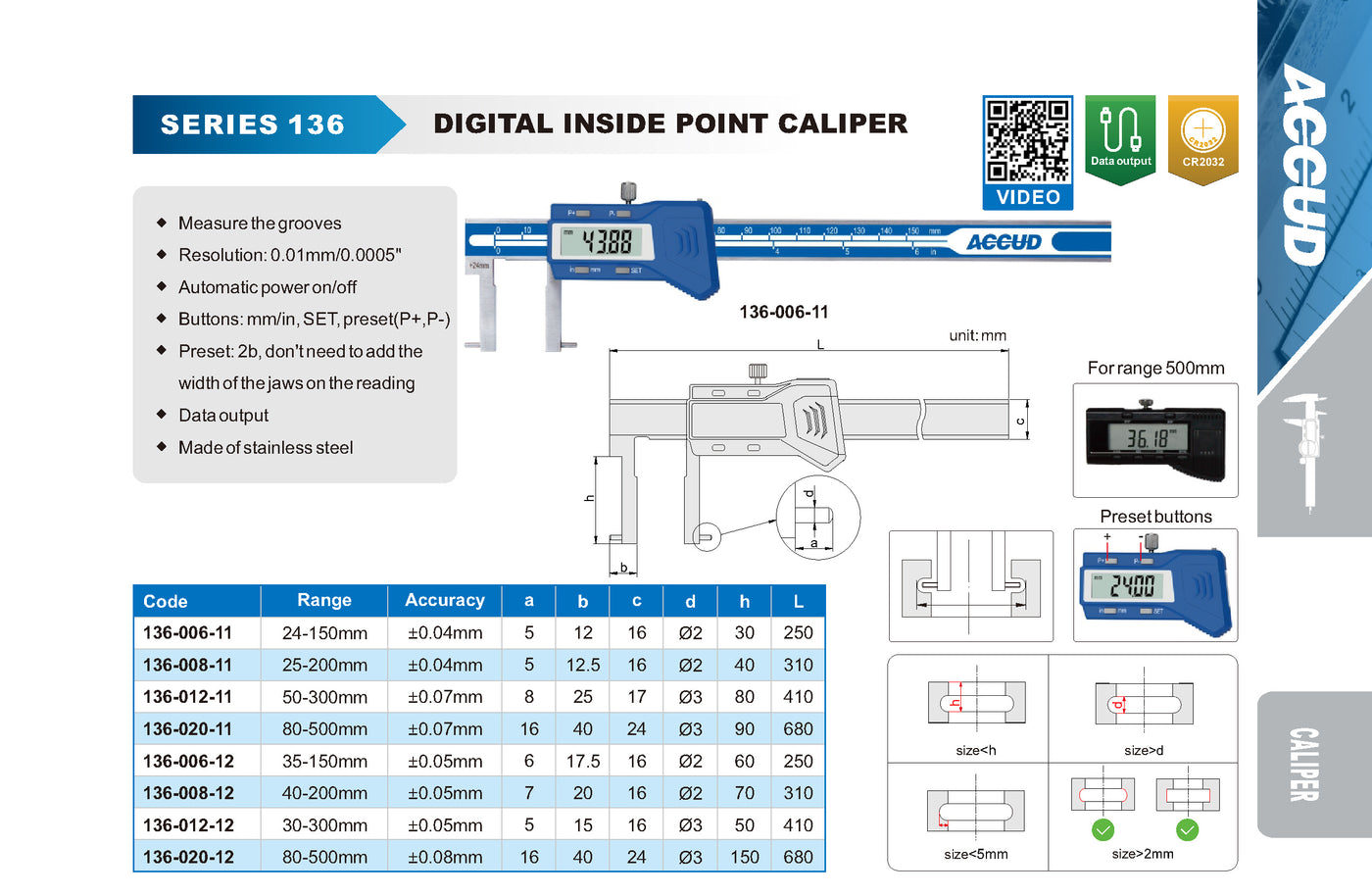 O Paquímetro Digital para Ranhuras Internas da linha 136 da ACCUD é projetado para medições precisas em sulcos e canais internos. Possui leitura digital com resolução de 0,01 mm, função preset para compensar a largura das pontas e estrutura em aço inox para maior durabilidade.