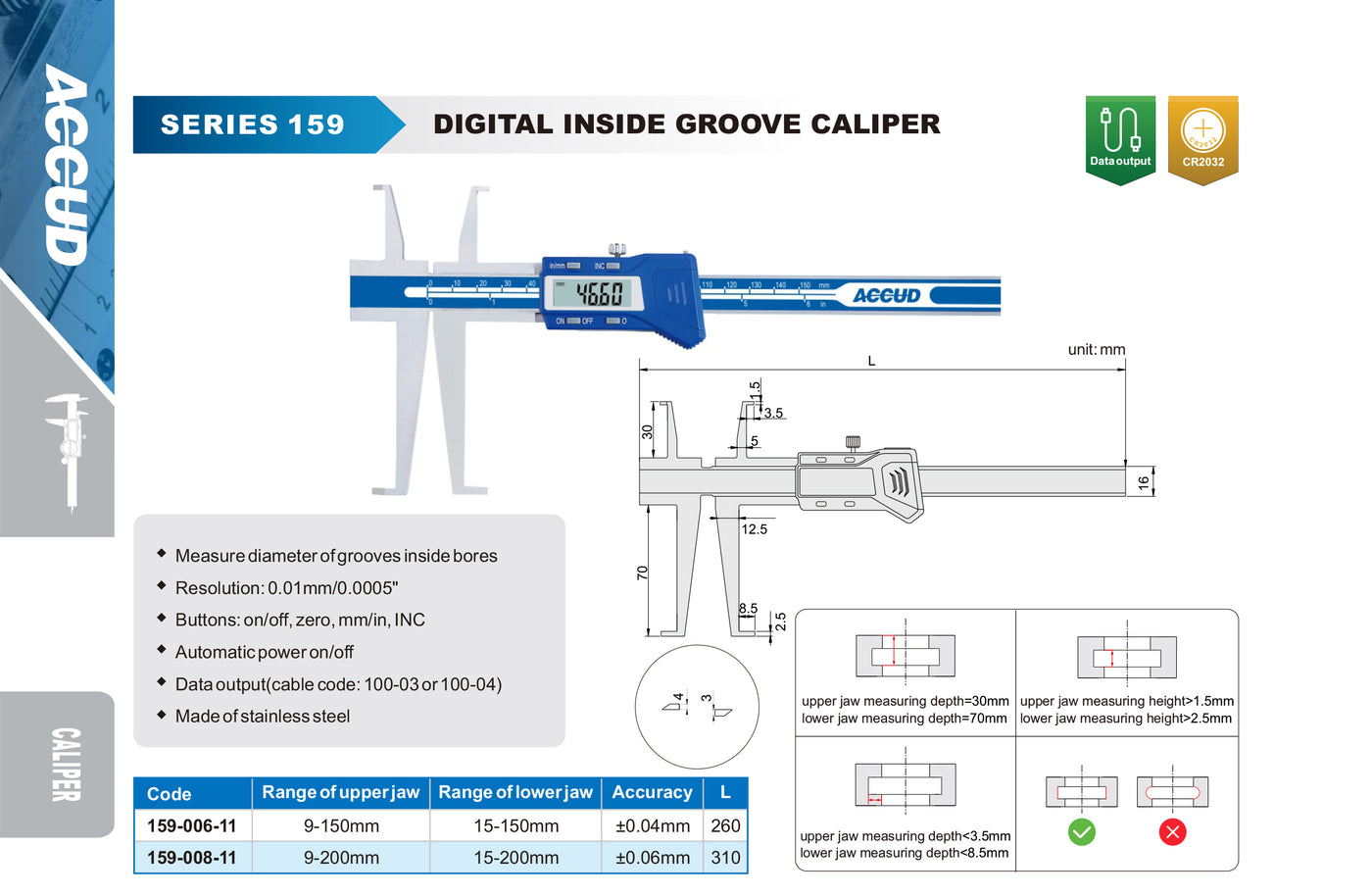 O Paquímetro Digital Série 159 foi projetado para medir com precisão o diâmetro de ranhuras internas em furos e cavidades. Com pontas ajustáveis e visor digital de fácil leitura, oferece alta precisão para aplicações industriais e mecânicas.