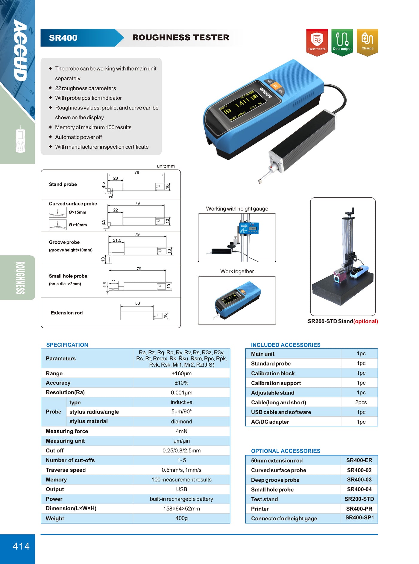 O Medidor de Rugosidade SR400 é um equipamento portátil e versátil projetado para medições precisas de acabamento superficial em diferentes tipos de peças. Com display gráfico e sonda destacável, permite visualizar perfis, curvas e valores de rugosidade diretamente na tela.
