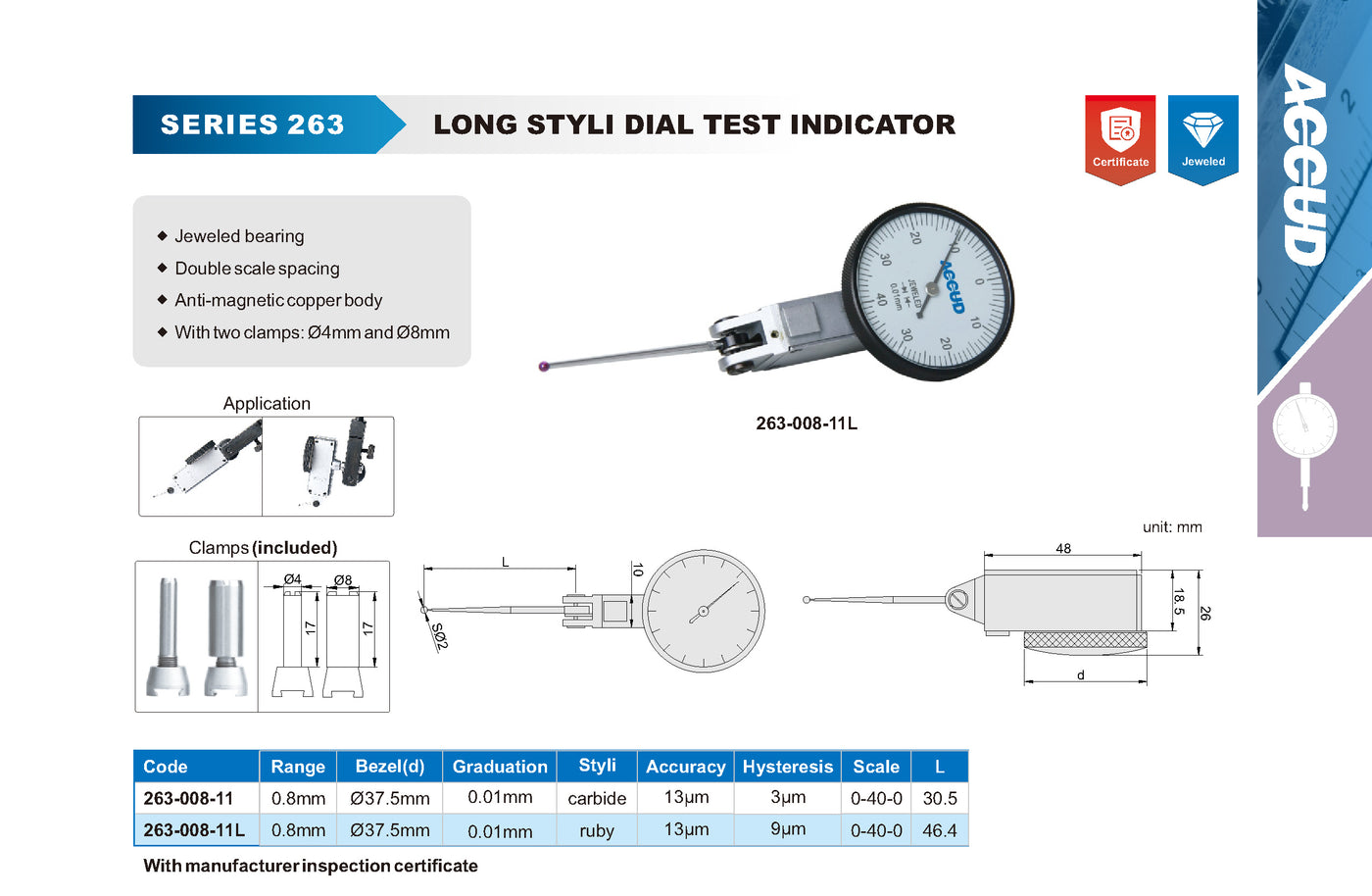 - Ponto de contato: fabricadas metal duro no modelo 263-008-11 e em rubi no modelo 263-008-11L;